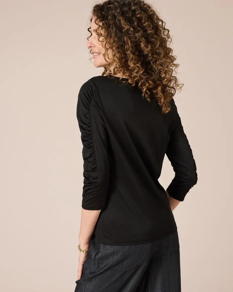 Entdecken Sie Ihr neues Lieblingsstück: Dieses Shirt vereint elegantes Uni-Design mit einem Hauch von Luxus. Der seidige Glanz und der modische Rundhalsausschnitt verleihen Ihnen eine stilvolle Ausstrahlung. Die dezenten Schulterpolster und der 3/4-Arm mit hübscher Raffung setzen besondere Akzente. Dank des hautsympathischen Viskose-Mixes genießen Sie dabei höchsten Tragekomfort. Dieses Shirt ist ein wahres Kombinationstalent: Ob zur eleganten Hose im Büro, zum verspielten Rock beim Stadtbummel oder zur lässigen Jeans beim Treffen mit Freunden – Sie sind immer perfekt gekleidet. Ein idealer Begleiter für jeden Anlass.